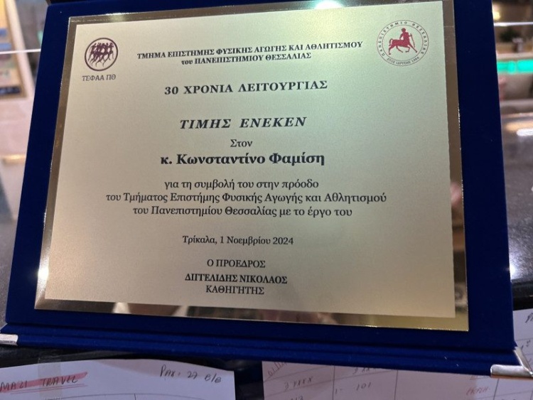 Σε μια ιδιαιτέρως συγκινητική, ειδική τελετή, ο πρόεδρος του τμήματος ΤΕΦΑΑ Τρικάλων του Πανεπιστήμιου Θεσσαλίας κ. Νικόλαος Διγγελίδης βράβευσε 8 εξαιρετικούς επιστήμονες μεταξύ αυτών και τον καθηγητής του ΤΕΦΑΑ κ. Κώστα Φαμίση για το πολυσχιδές έργο και την προσφορά του στο μάθημα της προπονητικής του ποδοσφαίρου .