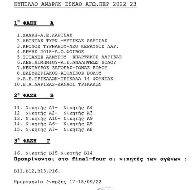 ΜΠΑΣΚΕΤ ΕΣΚΑΘ: η κλήρωση του κυπέλλου Από admin - 02/09/2022 0 11 Share Facebook Twitter Πραγματοποιήθηκε η κλήρωση των αγώνων της 1ης και 2ης φάσης του κυπέλλου μπάσκετ της ΕΣΚΑΘ. Αναλυτικά τα ζευγάρια που προέκυψαν: