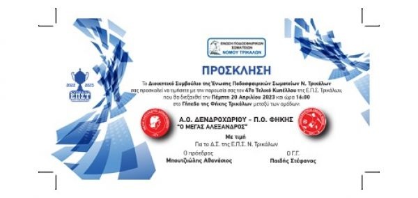 ΠΟΔΟΣΦΑΙΡΟ Την Πέμπτη 20 Απριλίου ο τελικός κυπέλλου της ΕΠΣΤ Από admin - 16/04/2023 0 44 Share Facebook Twitter Την ερχόμενη Πέμπτη 20 Απριλίου στο γήπεδο της Φήκης θα πραγματοποιηθεί ο φετινός τελικός του κυπέλλου της ΕΠΣ Τρικάλων. Αντίπαλοι θα είναι η Φήκη και ο Μέγας Αλέξανδρος Δενδροχωρίου. Αναλυτικά και η πρόσκληση της ΕΠΣ Τρικάλων
