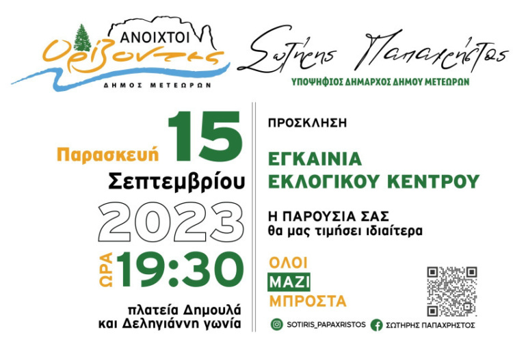 Την Παρασκευή 15 Σεπτεμβρίου 2023, στις 7.30 μ. μ. θα πραγματοποιηθούν τα εγκαίνια του Εκλογικού Κέντρου του ΣΥΝδυασμού ΑΝΟΙΧΤΟΙ ΟΡΙΖΟΝΤΕΣ του Υποψηφίου Δημάρχου Δήμου Μετεώρων Σωτήρη Παπαχρήστου.
