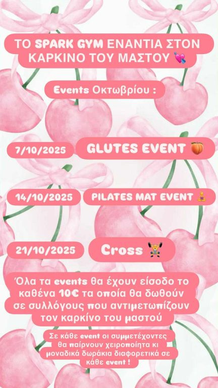 Ο Οκτώβριος είναι μήνας αφιερωμένος στην ευαισθητοποίηση για τον καρκίνο του μαστού και το Spark Gym Καλαμπάκας παίρνει ενεργά θέση στη μάχη αυτή. Με όπλο την άσκηση, την ενέργεια και την αλληλεγγύη, διοργανώνουμε μια σειρά από φιλανθρωπικά events, στηρίζοντας συλλόγους και ασθενείς που δίνουν τη δική τους μάχη.
