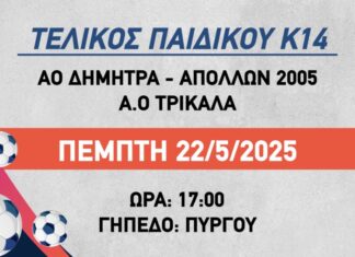 Ο τελικός του πρωταθλήματος υποδομών της ΕΠΣ Τρικάλων στην κατηγορία Κ14 θα γίνει την Πέμπτη 22 Μαΐου στο γήπεδο του Πύργου.