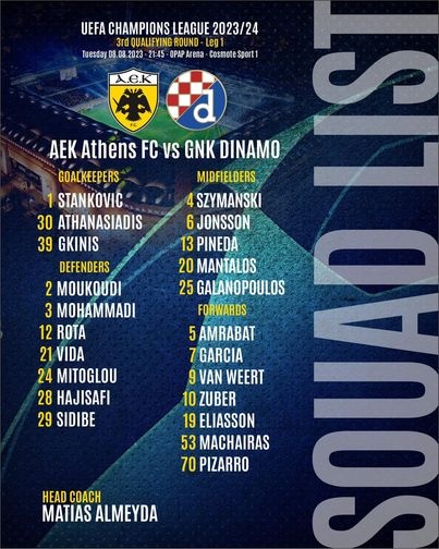 Μετά το τέλος της προπόνησης ο Ματίας Αλμέιδα ανακοίνωσε την αποστολή στην οποία βρίσκεται κανονικά ο Ντομαγκόι Βίντα. Αντίθετα εκτός είναι ο Μιγιάτ Γκατσίνοβιτς, ο οποίος έχει ενοχλήσεις και δεν προπονήθηκε.