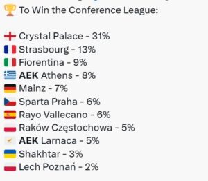 Νέες πιθανότητες κατάκτησης του Conference League έδωσε το OptaAnalyst, μετά και τα παιχνίδια της Πέμπτης. Η ΑΕΚ είναι 4ο φαβορί με ποσοστό 8% (ενισχυμένη κατά μια μονάδα από την περασμένη πρόβλεψη). Η Κρίσταλ Πάλας θεωρείται η πιο πιθανή νικήτρια του θεσμού με 31%. Ακολουθεί η Στρασμπούρ (πήρε την 1η θέση στη League Phase) με 13% και η Φιορεντίνα με 9%. Κάτω από την ΑΕΚ βρίσκονται Μάιντς (7%) και οι Ράγιο, Σπάρτα Πράγας με 6%.