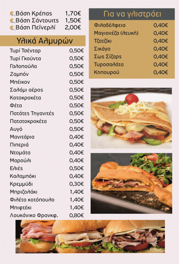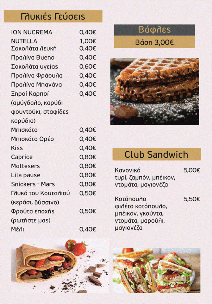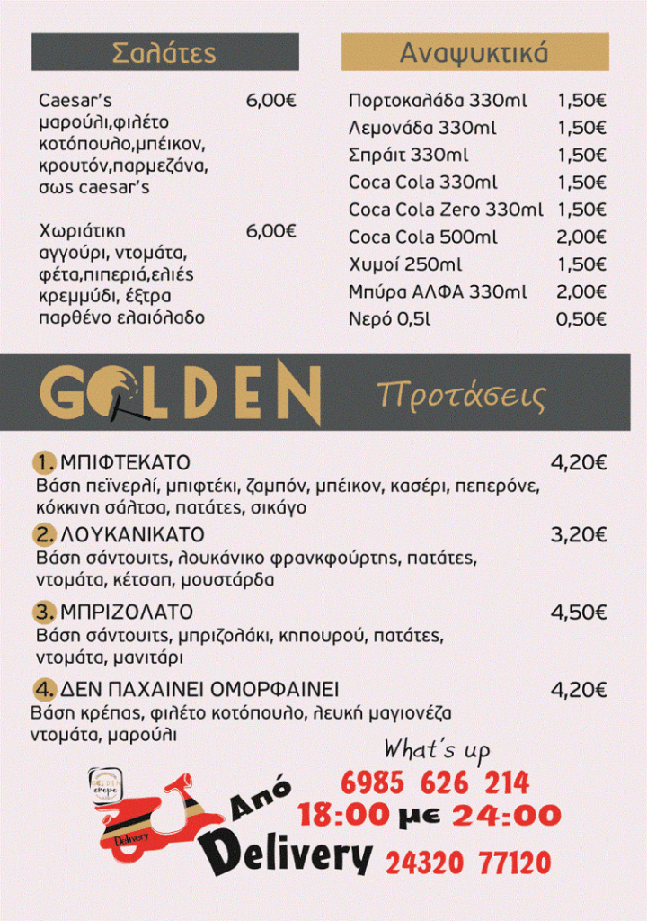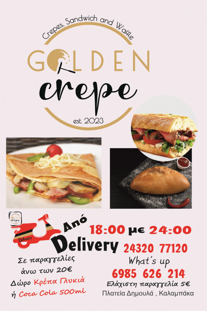 Αλμυρές και γλυκές κρέπες με πολλές επιλογές υλικών, βάφλες, Club Sandwitch, σαλάτες αλλά και οι GOLDEN προτάσεις σας περιμένουν να τις απολαύσετε καθημερινά είτε από το κατάστημα είτε στον χώρα σας DELIVERY καλώντας στο τηλ. 24320 77120 ή 6985 626214 ( whats up ) από τις 18:00 έως 24:00.