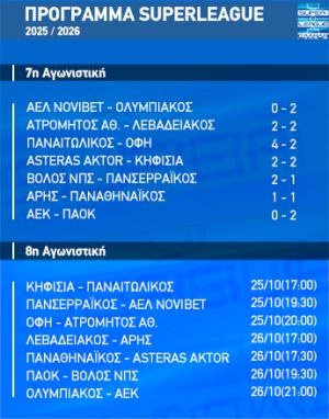 ΣΟΥΠΕΡ ΛΙΓΚ Super League: τα αποτελέσματα της 7ης αγωνιστικής και η βαθμολογία Από admin - 20/10/2025 0 18 Share Facebook Twitter Με τα 4 παιχνίδια που πραγματοποιήθηκαν το απόγευμα και βράδυ της Κυριακής ολοκληρώθηκε η 7η αγωνιστική της Super League. Αποτελέσματα, βαθμολογία και η επόμενη αγωνιστική: