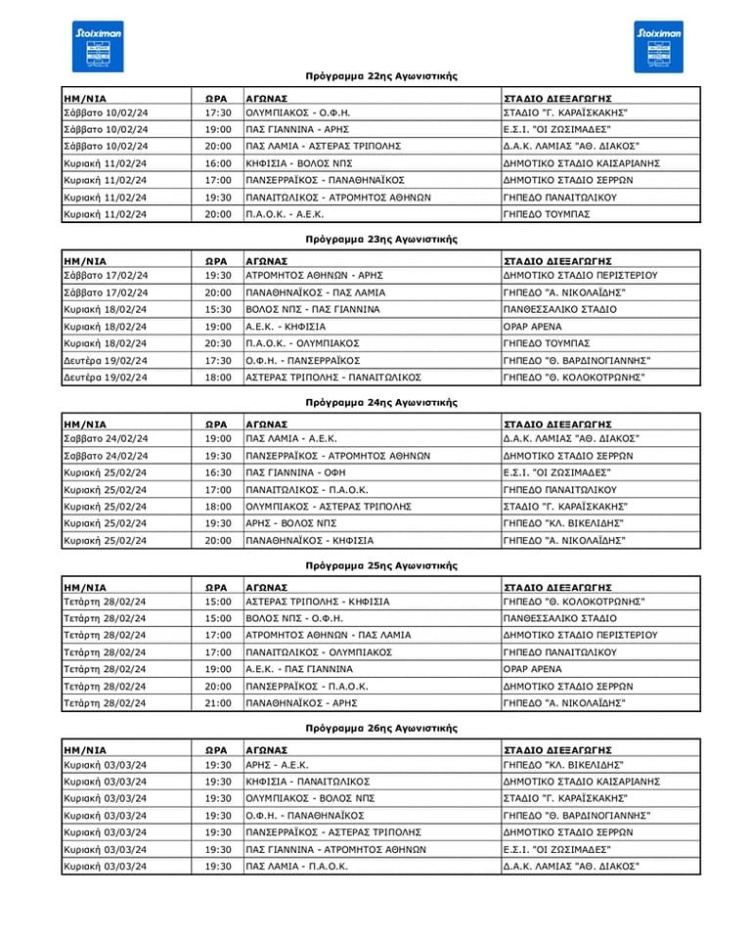Η Σούπερ Λιγκ γνωστοποίησε σήμερα το πρόγραμμα των αγώνων του πρωταθλήματος από την 22η αγωνιστικής μέχρι την τελευταία, την 16η.
